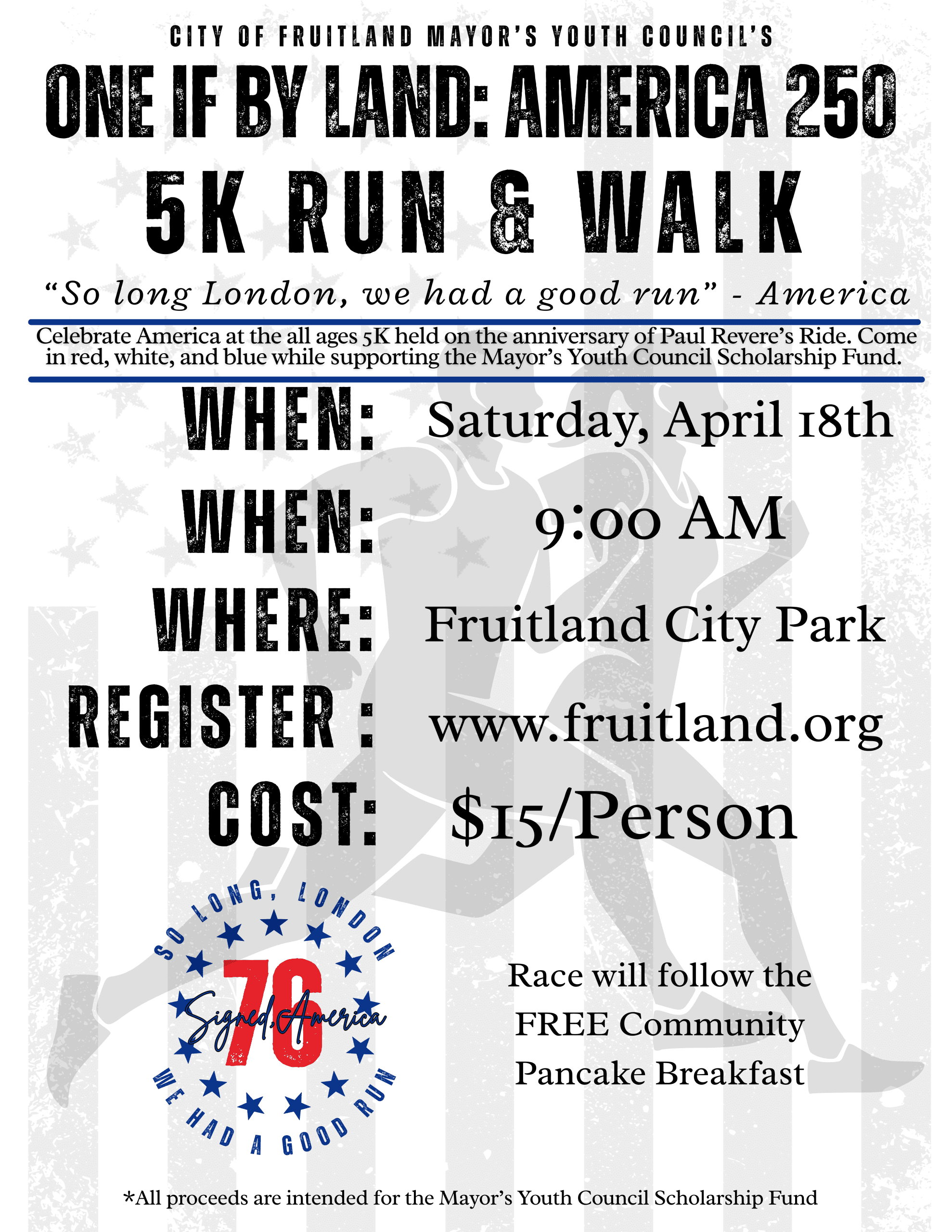 Join us for One if by Land: America 250, a fun, all-ages 5K hosted by the Mayor’s Youth Council and held on the anniversary of Paul Revere’s Ride. Inspired by the famous call that helped spark the American Revolution, this race is a chance to celebrate our country’s 250th birthday while coming together as a community.